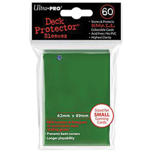 Almacena y protege tarjetas de tamaño pequeño (62 mm X 89 mm). Paquete de 60 unidades. Protectores de color verde solido el lado transparente utiliza material antideslumbrante para una sensación más suave y una mezcla más fácil. con sello de calidad Ultra PRO.